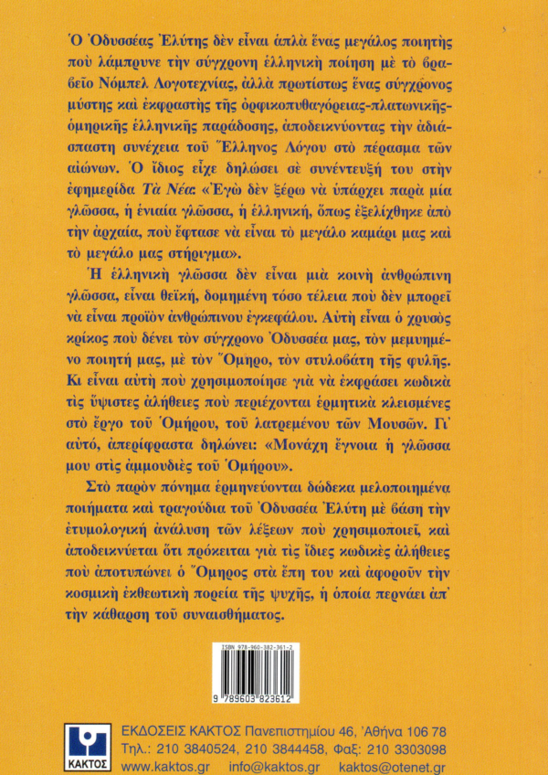 Στὸ παρὸν πόνημα ἑρμηνεύονται δώδεκα μελοποιημένα ποιήματα καὶ τραγούδια τοῦ Ὀδυσσέα Ἐλύτη μὲ βάση τὴν ἐτυμολογικὴ ἀνάλυση τῶν λέξεων ποὺ χρησιμοποιεῖ καὶ ἀποδεικνύεται ὅτι πρόκειται γιὰ τὶς ἴδιες κωδικὲς ἀλήθειες, ποὺ ἀποτυπώνει ὁ Ὅμηρος στὰ Ἔπη του καὶ ἀφοροῦν τὴν κοσμικὴ ἐκθεωτικὴ πορεία τῆς ψυχῆς, ἡ ὁποία περνάει ἀπὸ τὴν κάθαρση τοῦ συναισθήματος.